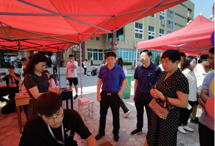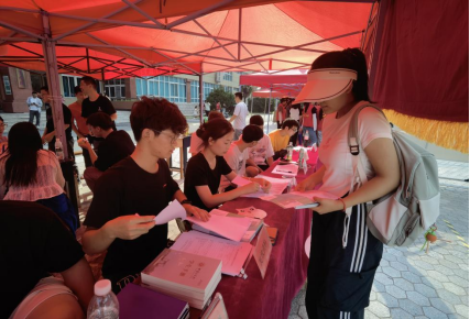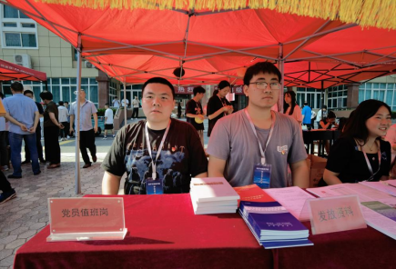 党总支书记李建伟、副书记杨向宇向学生发放资料,
