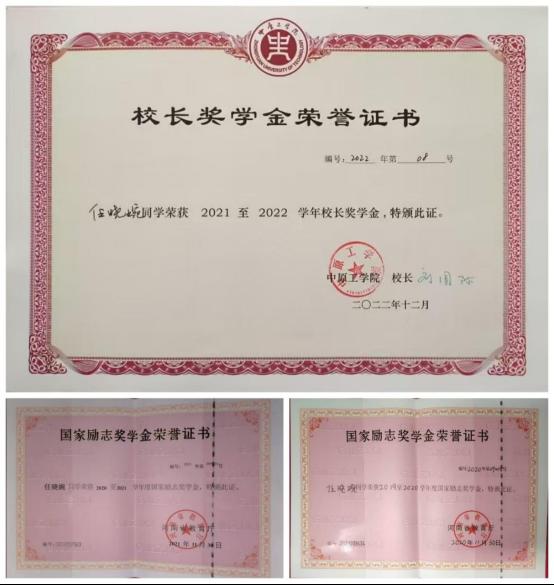她总是严格要求自己,课堂上她全神贯注,课后温故知新。宿舍、自习室、图书馆、小树林里的桌椅、运动场上的路延都是她课下学习的地点。她说:“学习难免会有惰性,每学期给自己设定一个小目标,有了目标,才有前进的动力和努力的方向。”英语四级就是她定下的第一个目标,她利用大一固定的早晚自习时间来学习英语,背单词、做阅读、找作文模板,通过每天的学习积累,大一下学期顺利通过英语四级考试。拿下了第一个目标,她对自己接下来的目标也有了拟定的方向和信心。于是奖学金、参加数学建模竞赛、英语六级、入党等等目标都分别列在了她每学期的计划里,每完成一项她会奖励自己一个在能力范围内的小礼物。通过老师的指导,自己的勤奋努力,她一步步实现了自己的目标。在校期间,德育素质测评成绩均为优,学年成绩排名多次年级第一,大二下学期通过英语六级考试。曾获校长奖学金、国家励志奖学金3次。