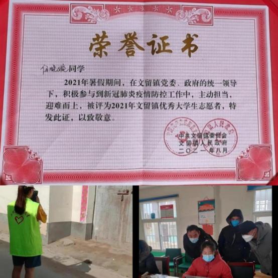 她曾受助于国家助学贷款、助学金。便将回报之情投入到服务社会的志愿活动中。利用假期,主动参与到自己家乡的“三下乡”活动,在家乡社区疫情防控工作中,主动担当,迎难而上,表现优异,被评为“2021年文留镇优秀大学生志愿者”。