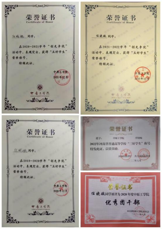她品行端正,始终拥护中国共产党的领导。担任班级团支书的四年期间里,组织班级积极参加校、院组织的各项活动,开展团课学习、团日活动,增强了团组织的凝聚力、激发了团员的创新意识和创造活力。她说:“班委工作是个良心工作,有时候自己很努力却得不到全部同学的认可,自己的积极性和热情受到打击。但既然选择了这个职务,就要坚持初心,本着服务同学、帮助同学的初衷,多说、多做、做实、做细,首先认可自己,总会得到大家的认可。”她尽职尽责,热心为同学们服务,主动关心帮助同学,遵守各项规章制度,在各方面起到了模范带头作用,具有强烈的责任感和事业心。曾获“河南省三好学生”、“校级优秀团干”,“校级五好学生”3次。