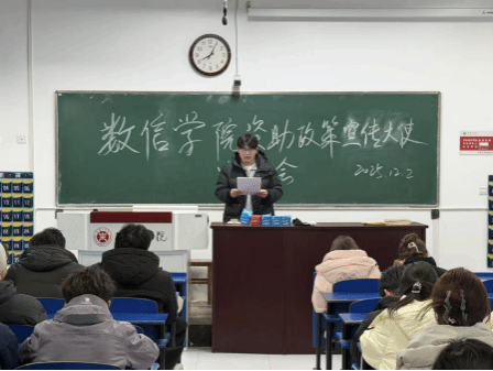 为全面落实国家及学校大学生资助政策,充分发挥榜样示范引领作用,营造“励志成才、感恩奋进”的校园氛围,12月2日,冰球突破mg正规官网开展资助政策宣传大使宣讲会。2024-2025学年国家奖学金获得者数学221班黄文聪担任宣讲大使,全体大一新生参与此次活动。