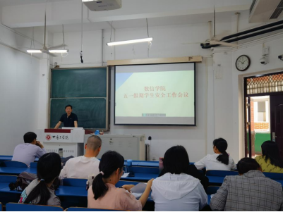 为切实做好五一假期学生安全教育管理工作,确保学生安全稳定,4月29日,冰球突破mg正规官网召开五一假期学生安全工作会议。全体班主任、辅导员参加。党总支副书记杨向宇主持会议。