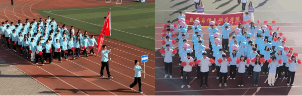 开幕式上,学院方阵身着蓝色队服有序入场,星星气球摆成“数信”首字母简写字样,红色彩球点缀边框,独特造型尽显创意与凝聚力。随后,各学院学子汇聚一堂,共同表演团体操,活力舞姿点燃现场气氛。