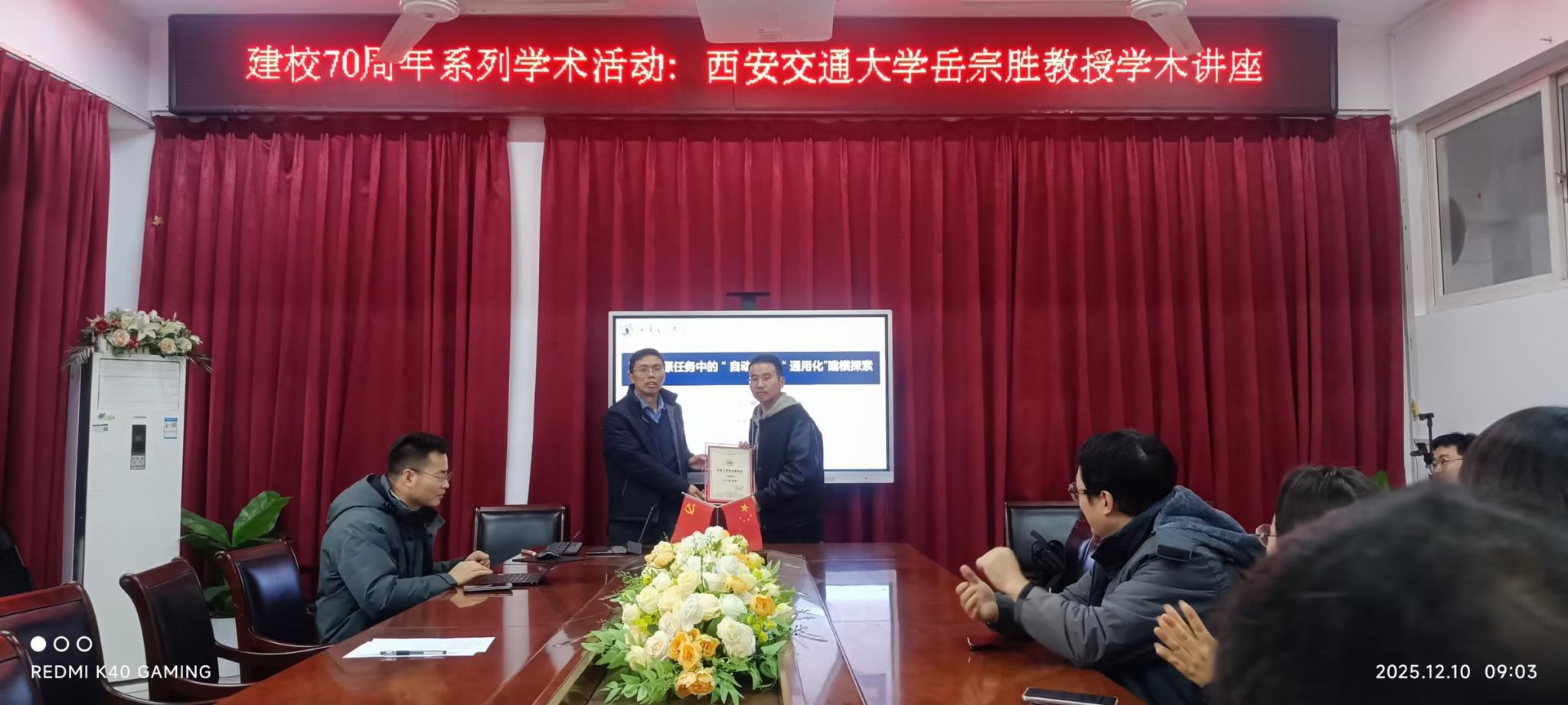 12月10日,应冰球官网科技处、冰球突破mg正规官网联合邀请,西安交通大学数学与统计学院教授、博士生导师岳宗胜在龙湖校区为冰球官网师生作“面向复杂场景的图像复原:从生成到去除”专题学术报告。相关专业师生到场聆听,报告会由冰球突破mg正规官网院长闫振亚主持。会前,闫振亚为岳宗胜颁发“弘德讲坛”主讲证书。